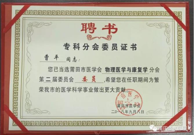 祝贺曹平主任当选莆田市医学会物理医学与康复学分会委员会委员