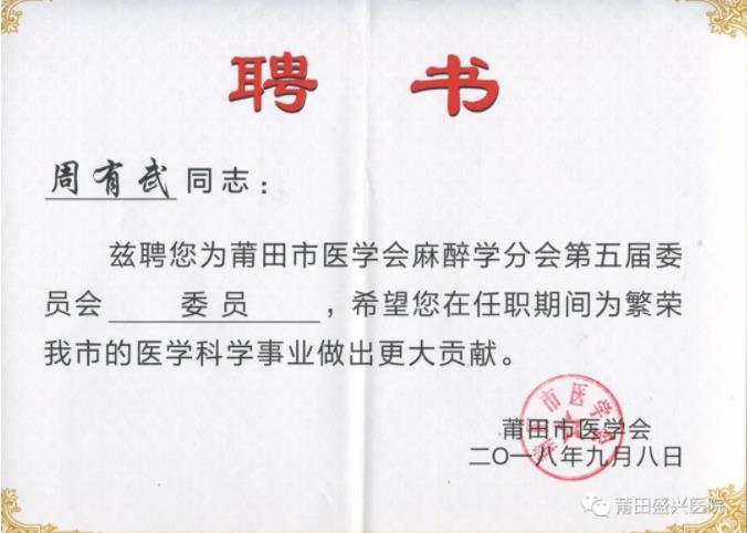 祝贺麻醉科主任周有武当选莆田市医学会麻醉学分会第五届委员