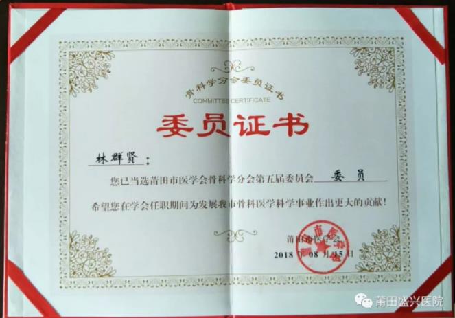 祝贺骨科主任林群贤当选莆田市医学会骨科学分会第五届委员会委员