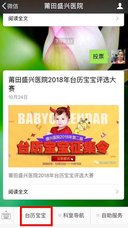 2、从图文消息或菜单栏找到“台历宝宝”后,按照提示上传“照片+姓名+联系电话+参赛宣言”,主办方审核通过后形成投票专属页面。电话号码请填写真实号码,以便领奖,我们将严格保护参赛对象的各项资料)