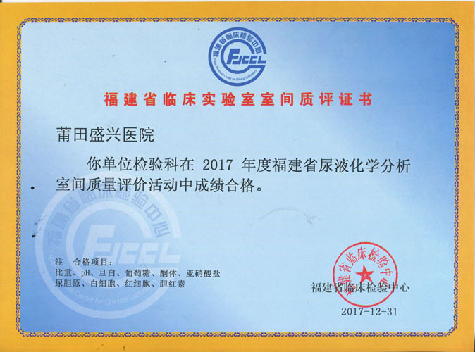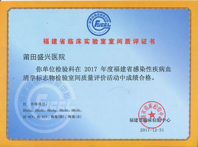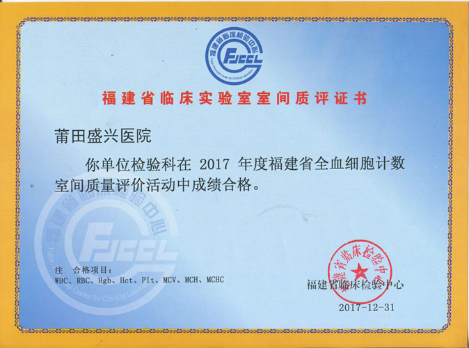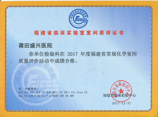 2017年参加了生化25项、尿液11项、肿瘤标志物9项、血凝4项、乙肝DNA、糖化血红蛋白、传染病11项、血型、共计68项,成绩全部合格。