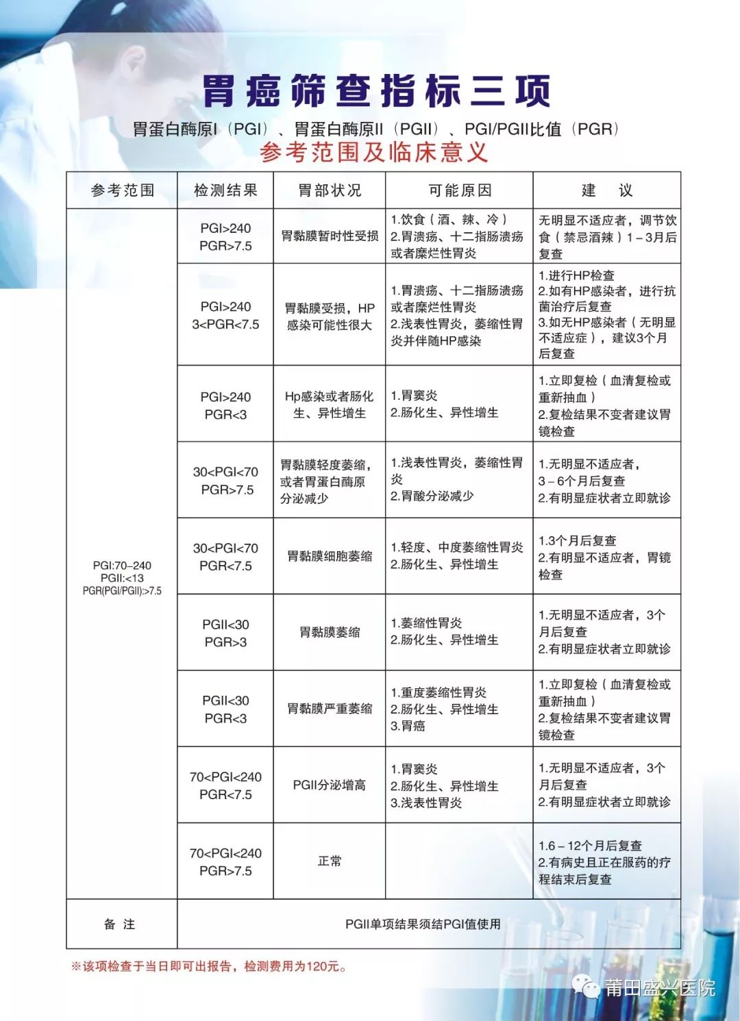 因此,我院检验科为给临床诊疗提供依据,近日开展了胃蛋白酶原I、胃蛋白酶原II的胃功能三项检测,检测手法为非侵入性,通过抽取人静脉血2~3ml(空腹),用血液标本进行检测,是一项无创、无痛、安全、经济的胃病检测方法,费用只要120元。其结果可反映胃粘膜的功能变化,如感染、炎症、溃疡、出血、萎缩、癌前病变及胃癌,是胃良性疾病和恶性病变一可靠的指标,也是治疗观察愈后的指标,更是准确诊断早期胃癌的利器。