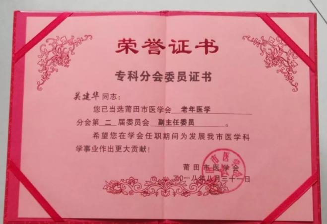 祝贺呼吸内科主任关建华当选莆田市医学会老年医学分会副主任委员